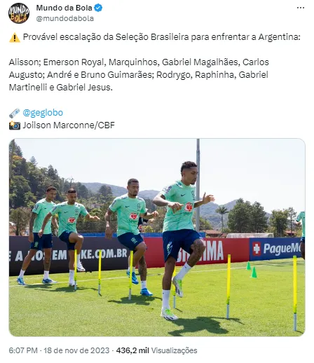 Após o Brasil perder de 2 a 1 para a Colômbia, de virada, Fernando Diniz promoverá mudanças na escalação. Carlos Augusto deve entrar no lugar de Renan Lodi, enquanto que Gabriel Jesus será a referência no ataque com a lesão de Vini Jr. André segue titular.