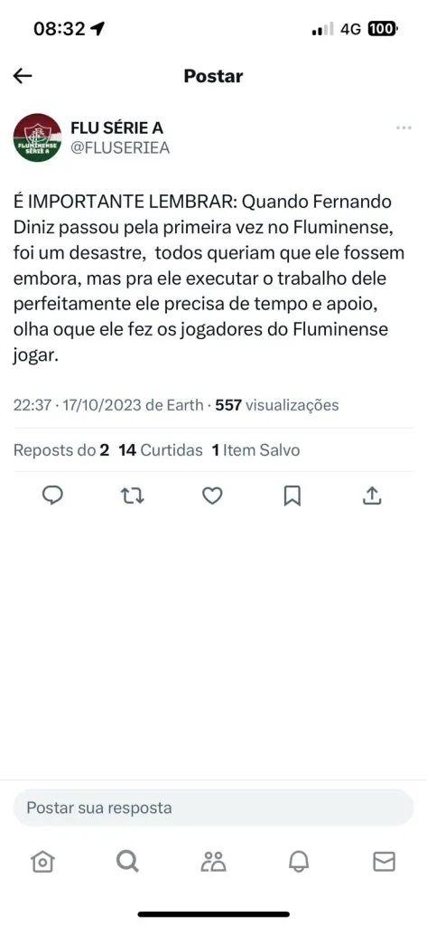Os olhos do torcedor do Fluminense estão voltados somente para a decisão do da Libertadores, que irá acontecer no próximo dia 4 de novembro, no Maracanã, diante do Boca Júniors. Mas, na madrugada de ontem, o torcedor do Tricolor das Laranjeiras teve que deixar a final do torneio continental de lado para defender o treinador de sua equipe: Fernando Diniz. Isso porque durante um desabafo nas redes sociais, Galvão Bueno acabou detonando a atuação do Brasil diante do Uruguai e principalmente as ideias do comandante do Fluzão em suas redes sociais.