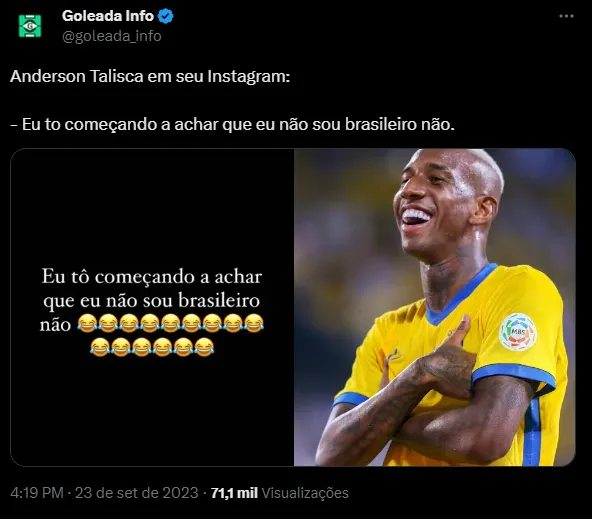 O companheiro de Cristiano Ronaldo no Al-Nassr postou uma mensagem no Instagram ironizando a lista de Fernando Diniz com o seguinte comentário: “Eu estou começando a achar que eu não sou brasileiro não”. Vale destacar que a convocação de Diniz saiu um dia depois de Talisca fazer dois gols na vitória do Al-Nassr sobre o Al-Ahli, por 4 a 3, o que deixou o atacante ainda mais inconformado por não ver o seu nome na relação.