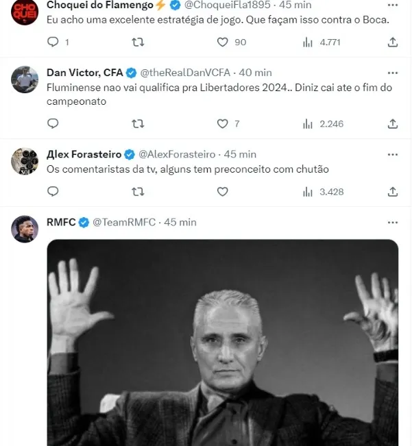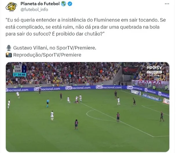 “Eu só queria entender a insistência do Fluminense em sair tocando. Se está complicado, se está ruim, não dá pra dar uma quebrada na bola para sair do sufoco? É proibido dar chutão?”, afirmou o profissional do Grupo Globo ainda no primeiro tempo do jogo, quando o confronto estava 3 a 1 para o Alvinegro.