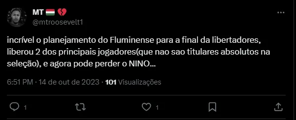 Faltando praticamente 15 dias para a grande decisão, o Fluminense recebeu uma péssima notícia vindo de Montevidéu, onde a Seleção enfrentará o Uruguai, na terça-feira. Isso porque o zagueiro Nino, titular absoluto da equipe de Fernando Diniz, sofreu uma entorse no joelho e teve que deixar o treinamento mais cedo. O jogador será reavaliado nos próximos dias para saber a gravidade da lesão.