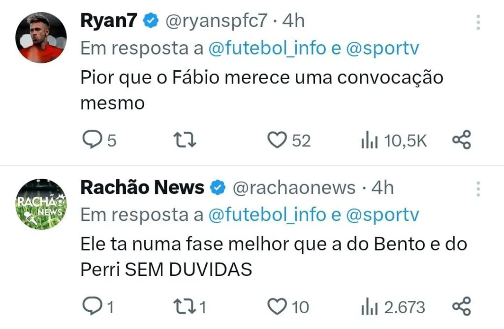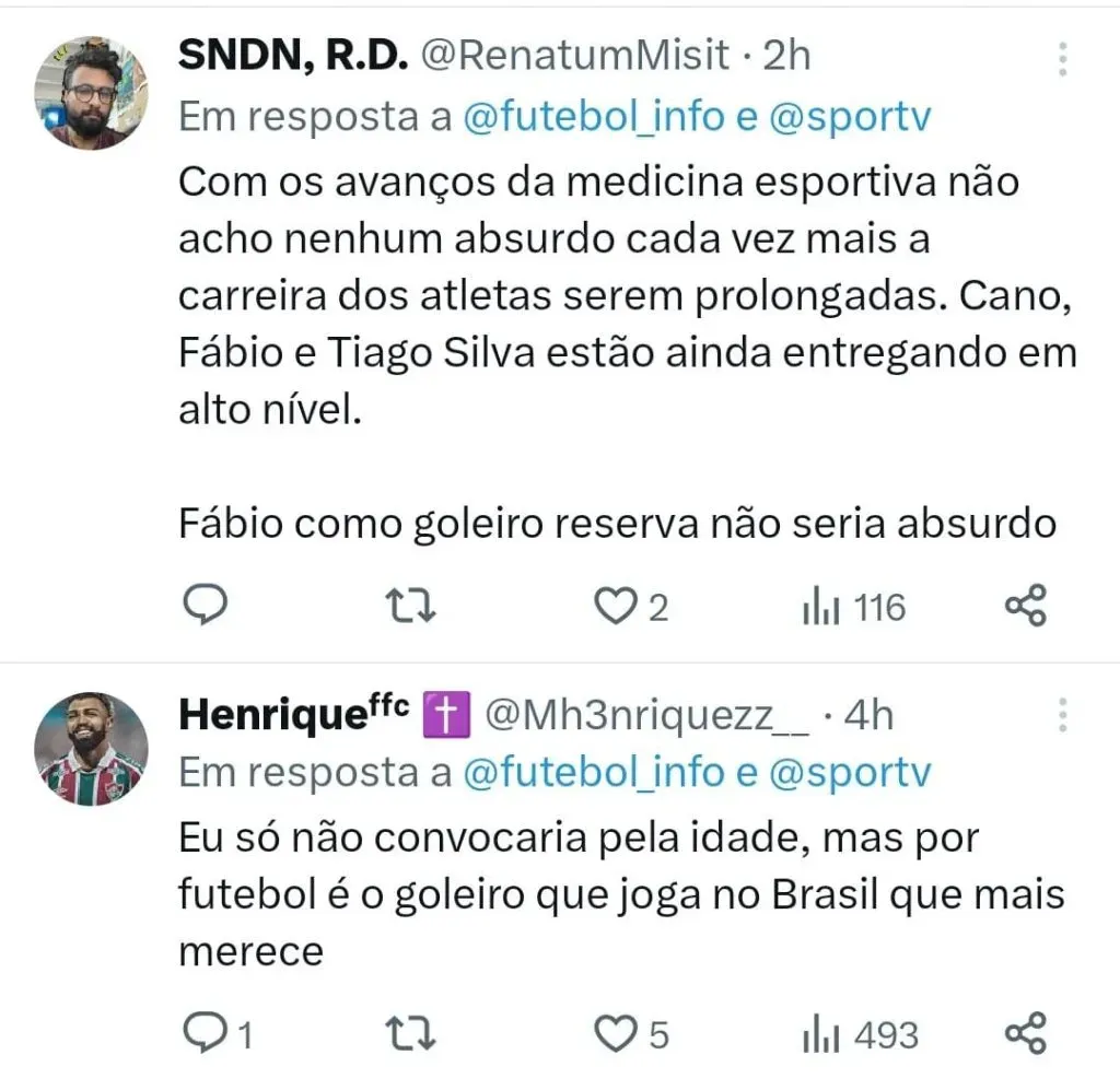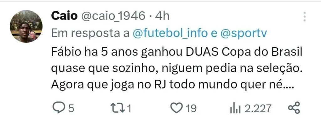 “O Fábio poderia ter sido convocado pra Seleção por MUITOS anos. Pra mim é o jogador mais injustiçado do Brasil nesse quesito. Mas vai convocar a esta altura?”, questionou um torcedor ponderando a idade do goleiro.