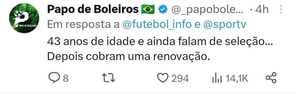 E ao que parece a idade seria justamente o grande obstáculo para uma possível convocação de Fábio. “Fábio, vive uma grande fase? Sim. Merece ser convocado? Sim. Convocaria? Não. Motivo? Tiraria a vaga de alguém mais novo, é época de renovação.”, avaliou outro.
