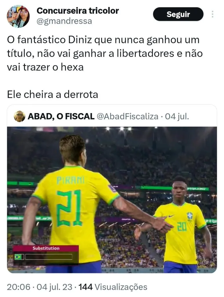 Vale destacar que o contrato atual de Diniz é de um ano. A intenção da CBF é que o técnico do Fluminense só fique no comando da equipe canarinho até a chegada de Carlo Ancelotti, em meados de 2024.