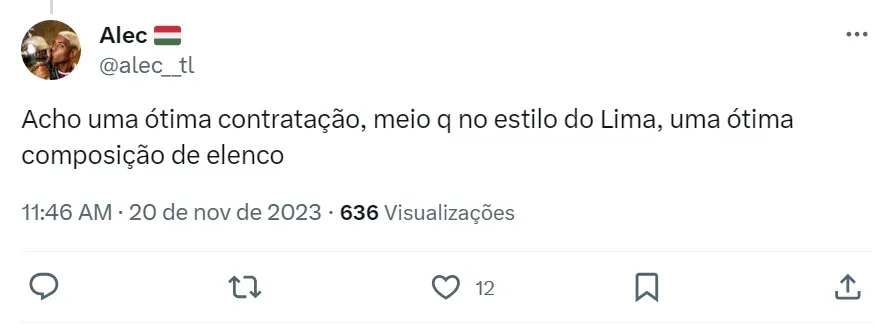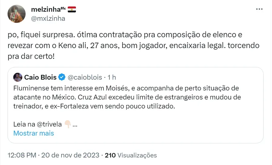 Nas redes sociais, a torcida do Fluzão aprova a contratação do atacante de 27 anos. Os tricolores acreditam que ele seria uma boa opção para compor o ataque do time de Fernando Diniz em 2024.