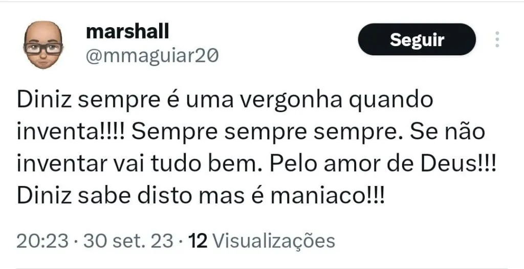 Um outro destacou que o técnico não consegue obter bons resultados quando inventa. “Diniz sempre é uma vergonha quando inventa!!!! Sempre sempre sempre. Se não inventar vai tudo bem. Pelo amor de Deus!!! Diniz sabe disto mas é maniaco!!!”, postou.