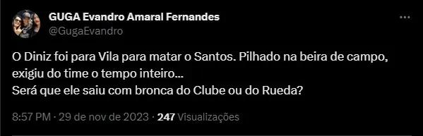 “Para de trotar, Martinelli” “Abre a boca, Nino” Diniz virou um torcedor a beira do campo, falou tudo que eu sempre quis falar. Kkkkkkkkkkkkk“, até mesmo a torcida comentou as broncas.