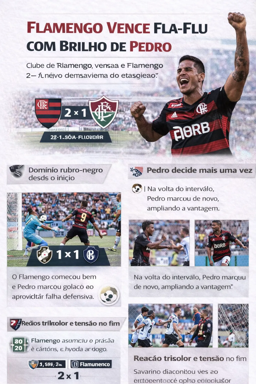 O Clube de Regatas do Flamengo venceu o Fluminense Football Club por 2 a 1, neste domingo (12), no Estádio do Maracanã, pela 11ª rodada do Brasileirão. O grande nome da partida foi Pedro, autor dos dois gols que garantiram o triunfo rubro-negro no clássico.