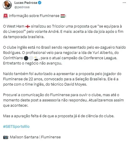 De acordo com Pedrosa, o West Ham estaria recebendo auxílio do ex-zagueiro Naldo Rodrigues para assinar com o volante André. Além de estar à disposição para esperar o jogador até o fim da temporada, a equipe de Londres também demonstrou estar disposta a equiparar a oferta do Liverpool. Até o momento, os Reds ficaram inclinadas a propor cifras que chegam a R$ 160 milhões.