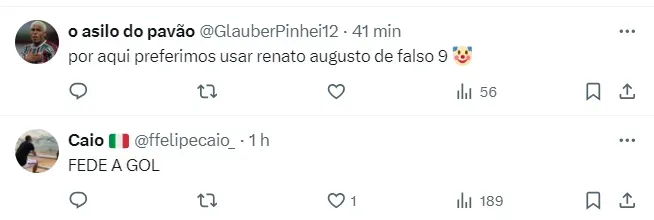 Nas redes sociais, os Tricolores aproveitaram para ressaltar o quão útil o jogador pode ser ao Flu: “Por aqui preferimos usar Renato Augusto de falso 9 (emoji de palhaço)”, escreveu um dos torcedores.