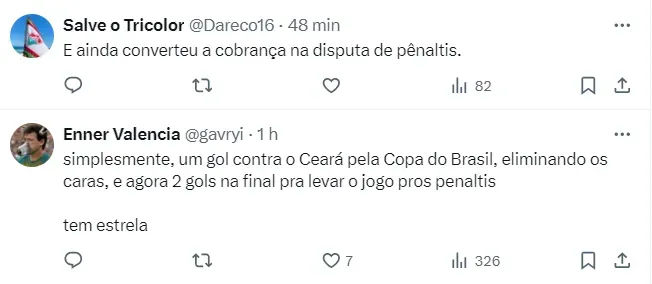 “Simplesmente, um gol contra o Ceará, pela Copa do Brasil, eliminando os caras. E agora dois gols na final pra levar os jogos para os pênaltis. Tem estrela”, escreveu o Tricolor.