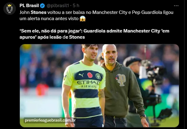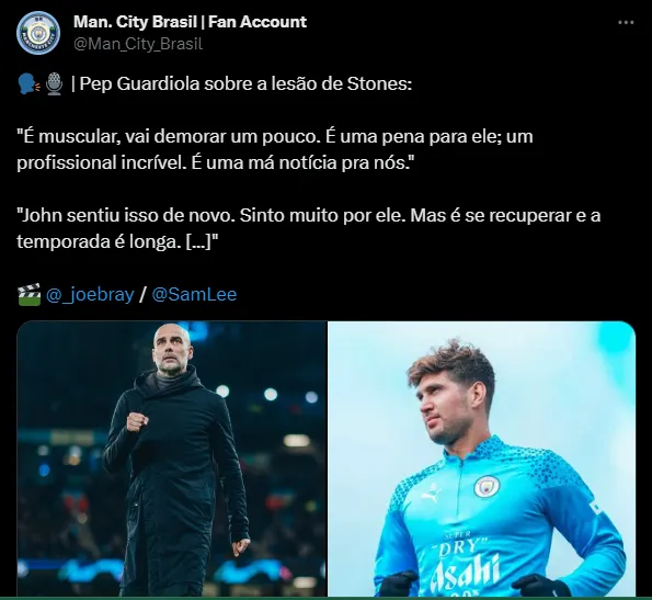 “John (Stones) sentiu de novo. Bom, sinto muito por ele. É uma grande perda para nós. É muito importante no que faz. Ele voltará mais forte, mas acho que ficará afastado por um bom tempo. É muscular”, disse Guardiola.