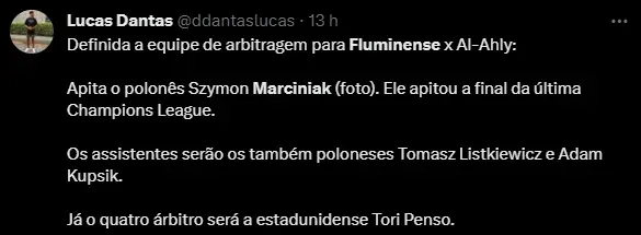 Está chegando a hora, torcida do Fluminense. Nesta segunda-feira (18), o Flu estreia no Mundial de Clubes contra o Al Ahly, pela semifinal. A partida será apitada pelo árbitro polonês Szymon Marciniak, que tem algumas polêmicas.