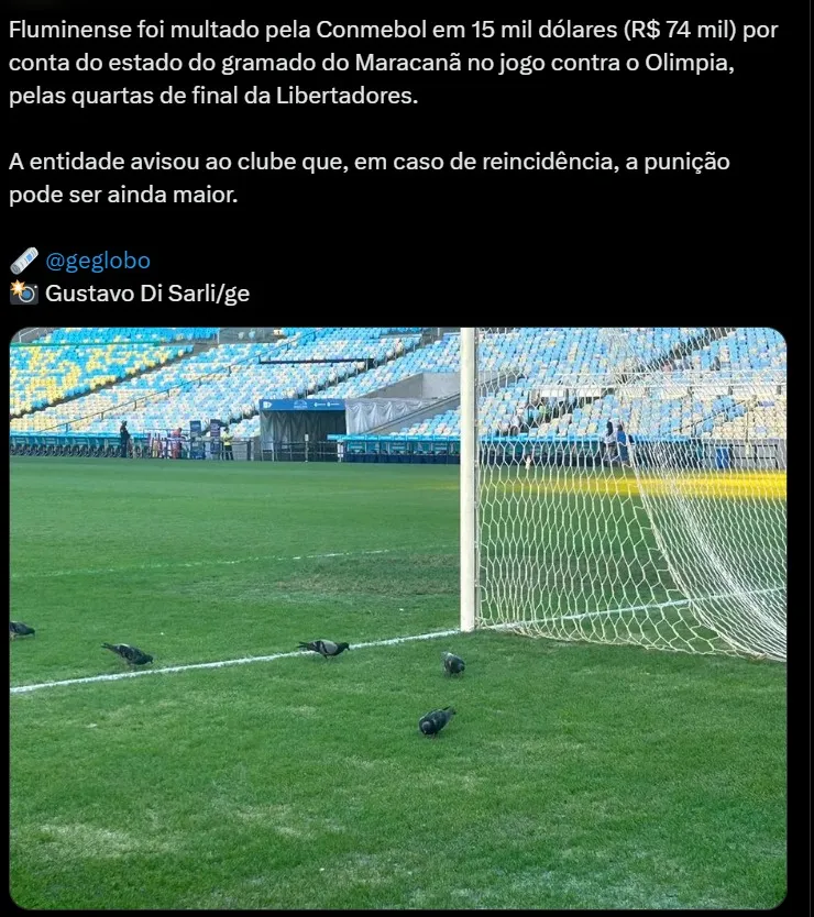 Isso porque, o Fluminense foi multado pela Conmebol em 15 mil dólares, cerca de R$ 74 mil na cotação atual, por conta do estado do gramado do Maracanã no jogo de ida das quartas de final da Libertadores, diante do Olimpia. Além da multa, a entidade também advertiu o Clube, porque se houver reincidência a punição será ainda maior, conforme informações do portal GE.