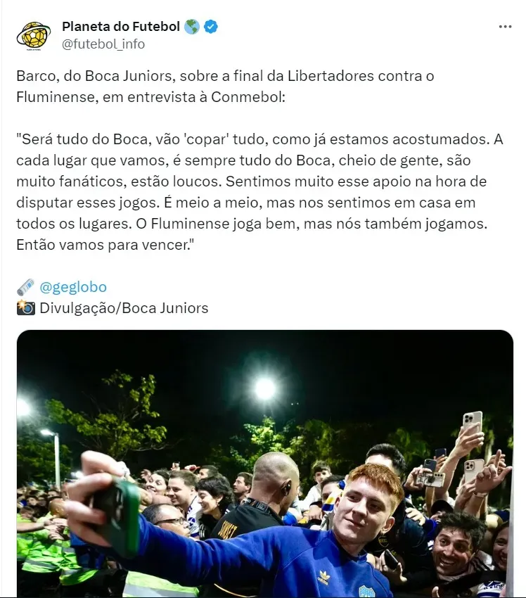 Quando questionado se irá torcedor para o Fluminense ou Boca Juniors na decisão que será disputada no Maracanã, o mandatário não ficou em cima do muro e cravou. Desde que assumiu a SAF do Botafogo no Brasil, o norte-americano demonstrou seu amor pelo país e não poderia ser diferente em relação a torcida.