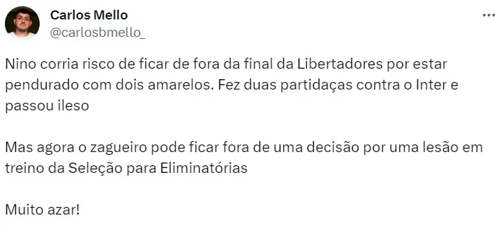 Se confirmada, a lesão poderá tirar Nino da grande final da Conmebol Libertadores. Assim, ele será o terceiro zagueiro do Fluminense a desfalcar a equipe em 2023. Anteriormente, Vitor Mendes foi suspenso por envolvimento em esquemas de apostas. Além dele, Manoel também pegou suspensão, mas por ser pego no doping.