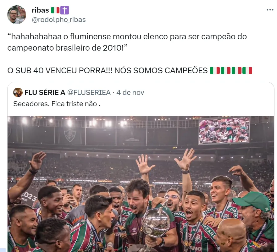 Após o Fluminense ser campeão da Copa Libertadores em cima do Boca Juniors, da Argentina, o zagueiro Felipe Melo provocou que o sub-40 conquistou um titulo inédito para o Tricolor das Laranjeiras.