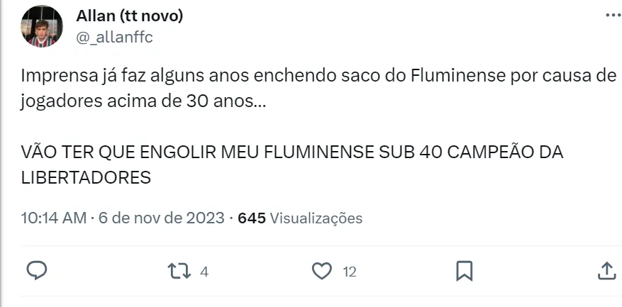 De fato, o time titular do Fluminense tem muitos jogadores acima dos 30 anos, como o goleiro Fábio (43), o prório defensor Felipe Melo (40), o lateral-esquerdo Marcelo (35), o atacante Cano (35), entre outros.