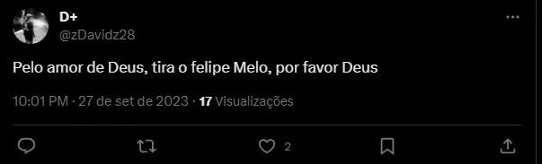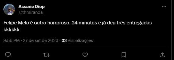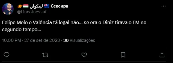 “Felipe Melo tá querendo entregar a paçoca mesmo?”, “Pelo amor de Deus, tira o felipe Melo, por favor Deus”, “Felipe Melo e Valência tá legal não… se era o Diniz tirava ele no segundo tempo…” e “Felipe Melo é outro horroroso. 24 minutos e já deu três entregadas kkkkkk”, foram alguns dos comentários dos torcedores, preocupado com a situação do jogador.