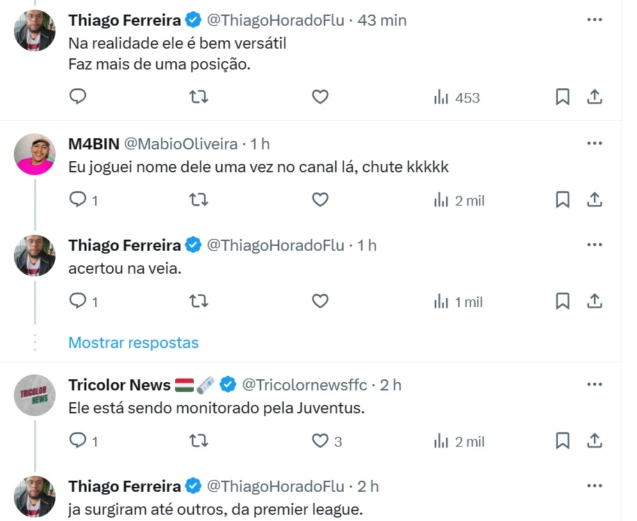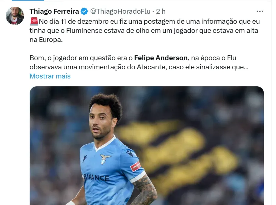 O setorista Thiago Ferreira informou que um nome observado pelo Fluminense é o de Felipe Anderson. Revelado no Santos, o meia está em final de seu contrato na Lazio, da Itália.