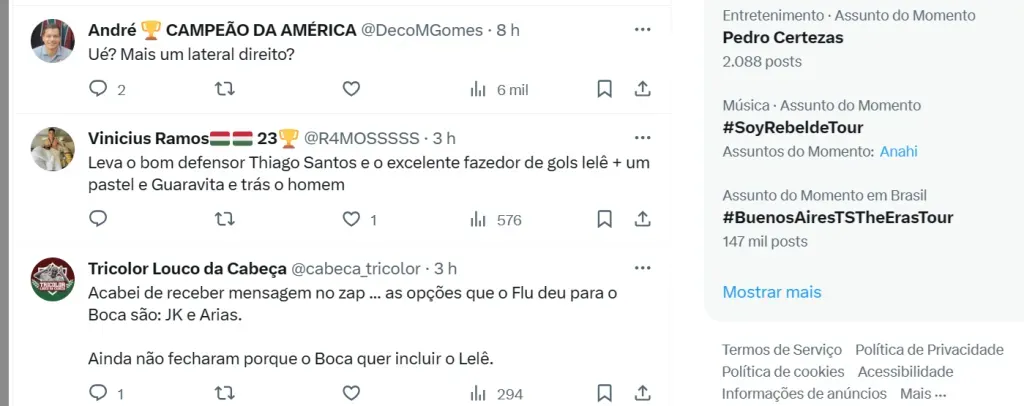 A sondagem ao Boca por Advíncula também rende jogadores do Fluminense em troca com o time argentino, informa Araújo em sua conta pessoal no Twitter.