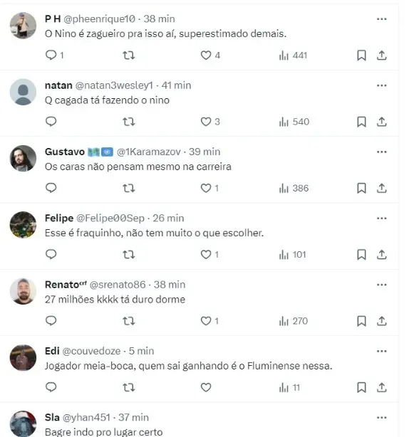 Vale mencionar que ainda neste ano Nino esteve próximo de deixar o Fluminense e assinar com Nottingham Forest, da Inglaterra. Os ingleses pagariam 7 milhões de euros (R$ 37, 5 milhões).