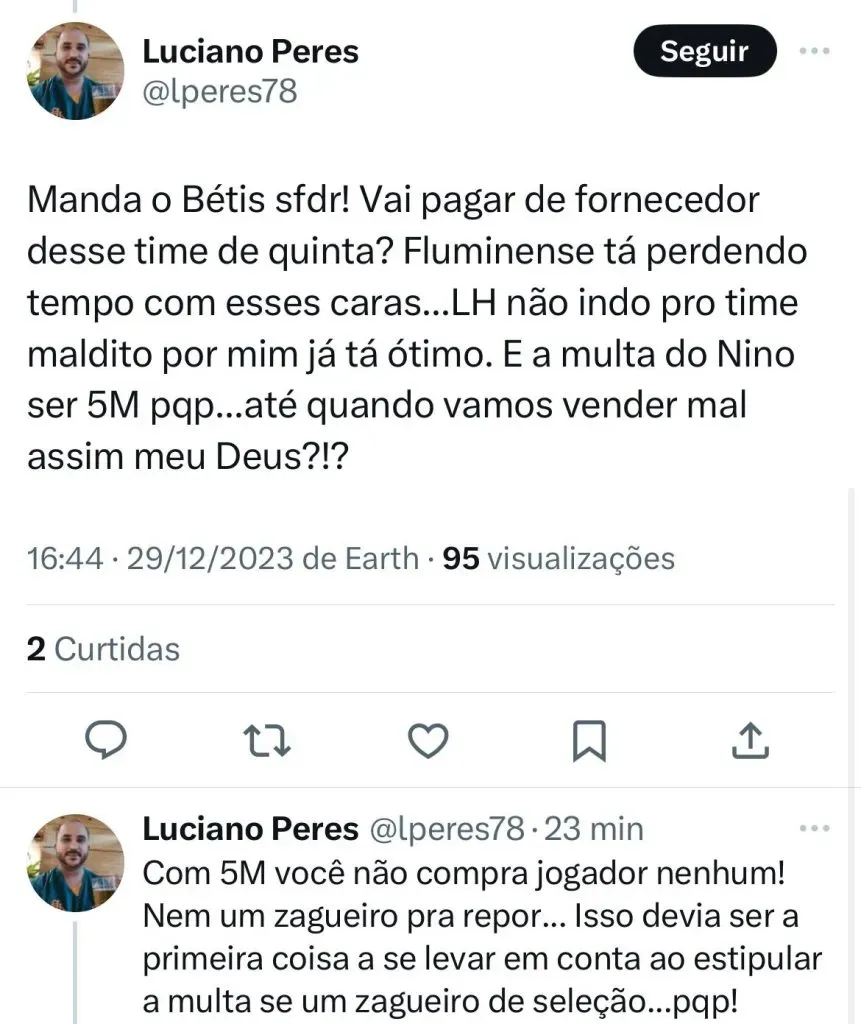 Segundo apuração do jornalista espanhol Pepe Elías, o Real Bétis (ESP) negocia a contratação do zagueiro Nino, do Fluminense. Curiosamente, o Tricolor já negocia com os espanhóis para tentar uma volta de Luiz Henrique e chegou a propor uma troca.