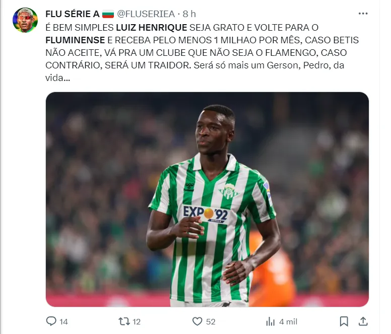 Mas, para isso, não terá uma tarefa fácil, já que tem uma concorrência pesada. Já que o Flamengo, seu concorrente direto, monitora a situação de Luiz Henrique, que deve ser definida nesta quinta-feira (28). Isso porque o Betis tem uma reunião onde vai avaliar as propostas dos clubes brasileiros.