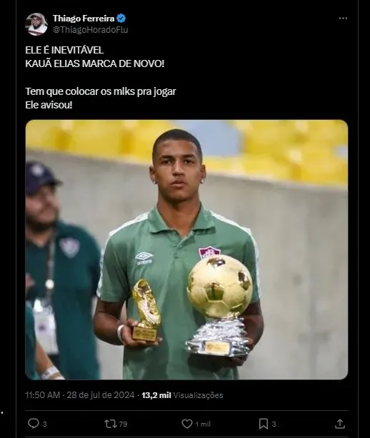 Dessa vez, Kauã marcou o gol que decidiu a partida entre Bragantino x Fluminense. Após a partida, a torcida tricolor elogiou o bom momento vivido pelo atacante da base tricolor e foi destacado nas redes sociais.