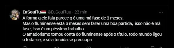 As críticas ao treinador aumentaram, já que o Fluminense venceu apenas 1 jogo das últimas oito partidas do Campeonato Brasileiro 2024. Confira a seguir os comentários da torcida do Fluminense sobre Fernando Diniz e a má fase do tricolor.
