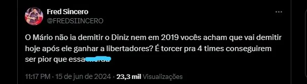 O principal culpado pela sequência negativa nas redes sociais foi o treinador Fernando Diniz. Nas mensagens, havia um misto de agradecimento pelas conquistas recentes do tricolor carioca com o treinador. Por outro lado, vários torcedores pediram sua saída.