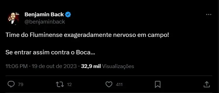 Diante da atuação da arbitragem, o elenco não conseguiu segurar o nervoso e acabou prejudicando a equipe em alguns momentos da partida. Através das redes sociais, Benjamin Back destacou isso no Fluminense e fez um alerta. “Time do Fluminense exageradamente nervoso em campo! Se entrar assim contra o Boca…”, sugeriu. A equipe argentina chegou a final sem vencer nenhum jogo no mata-mata e pode usar esse ‘temperamento’ no elenco carioca contra eles.