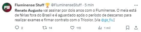 Entretanto, a notícia que brindou a sexta-feira (8) do Fluminense foi o acerto do Tricolor com o meia Renato Augusto, que foi dispensado pelo Corinthians e no mesmo dia, uma durante reunião no CT Carlos Castilho encaminhou a sua transferência para o Time de Guerreiros.