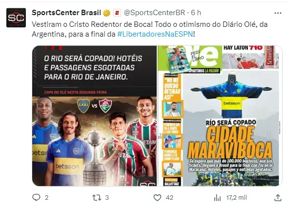 No subtítulo da capa, os jornalistas argentinos ainda fizeram questão de destacar o número de torcedores do Boca Juniors que estarão no Rio de Janeiro para a grande final. “A expectativa é que mais de 100 mil bosteros, mesmo sem ingressos, cheguem ao Brasil para a final contra o Flu no Maracanã. Hotéis, passagens e ingressos esgotados”, diz o jornal.