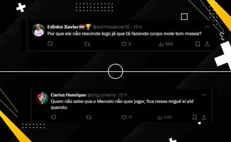 Um torcedor foi direto ao afirmar que o medalhão não parece estar se esforçando para voltar e ficar disponível. Outro tricolor já alegou que o lateral estaria fazendo corpo mole no Clube. “Quem não sabe que o Marcelo não quer jogar, fica nesse migué aí até quando”. “Por que ele não rescinde logo já que tá fazendo corpo mole tem meses?”.