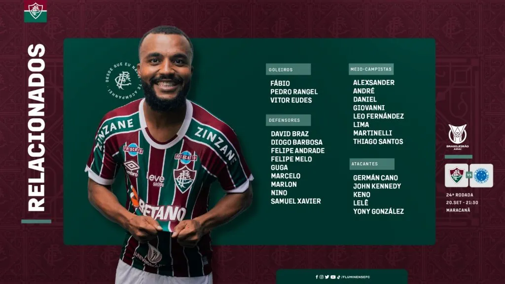 Confira a lista de relacionados do Fluminense para encarar o Cruzeiro nesta quarta-feira (20): Fábio, Pedro Rangel e Vitor Eudes (goleiros); Samuel Xavier, Guga, Marcelo e Diogo Barbosa (laterais); David Braz, Felipe Melo, Nino e Marlon (zagueiros); Alexsander, André, Daniel, Giovanni, Leo Fernández, Lima, Martinelli e Thiago Santos (meio-campistas); Germán Cano, John Kennedy, Keno, Lelê e Yony González (atacantes).