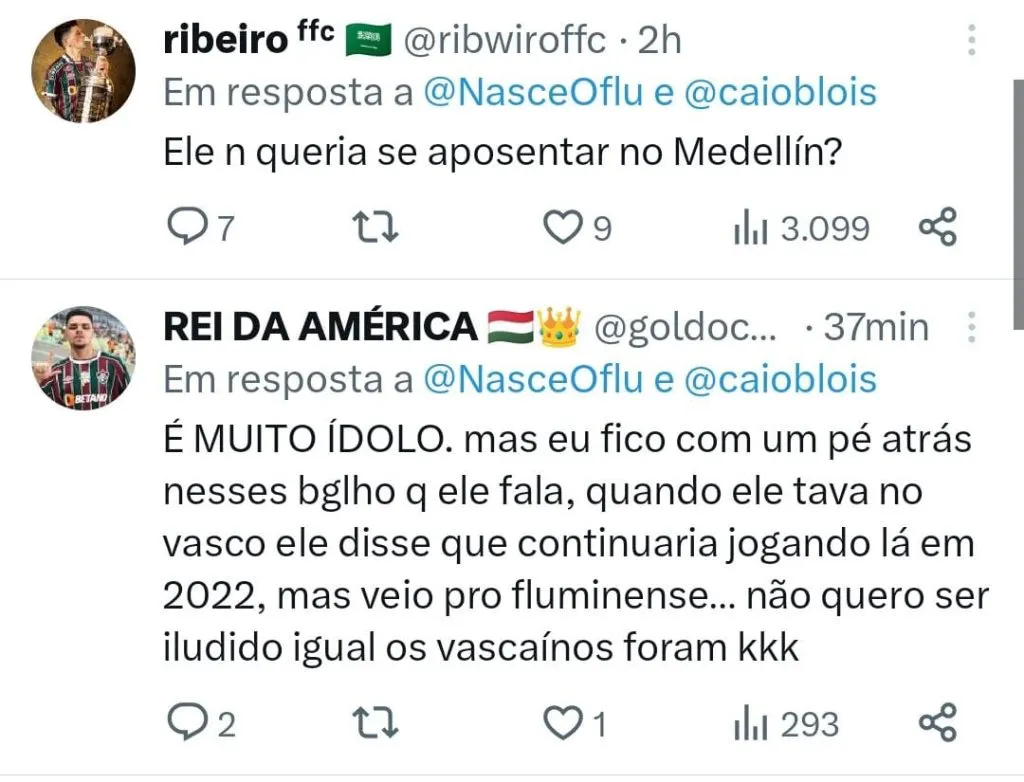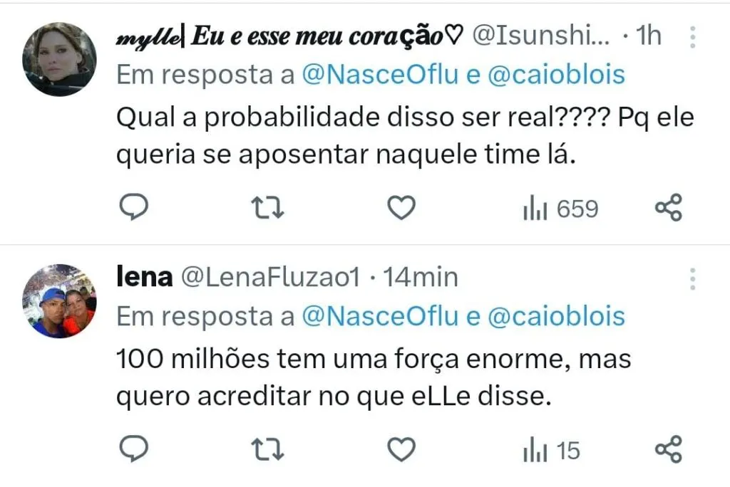 Durante entrevista ao Trivela, o jogador falou sobre a especulação e resposta foi uma verdadeira declaração de amor ao Fluminense. “Será muito difícil. São 100 milhões de reais, não é? (risos). Quero passar a vida aqui”, disse em tom bem humorado.