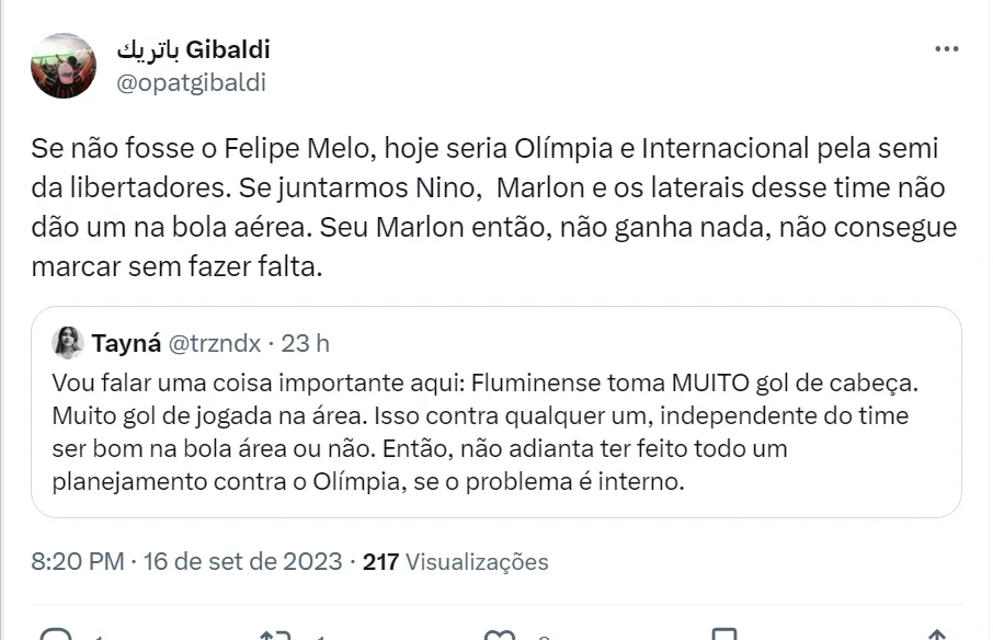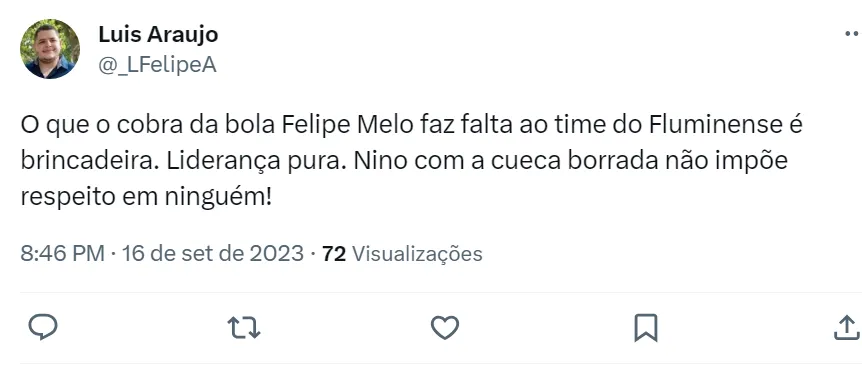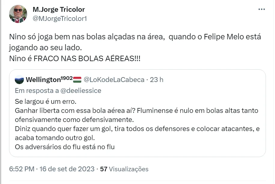 Na visão dos torcedores, Nino não é um bom líder e só consegue jogar bem quando está do lado de Felipe Melo (como pode ver nos comentários acima). Nino está no Fluminense desde 2019 e é titular absoluto no time de Diniz. Felipe Melo, por sua vez, ganhou a vaga na equipe nesta temporada e desbancou Marllon, que chegou no meio do ano vindo da Europa.