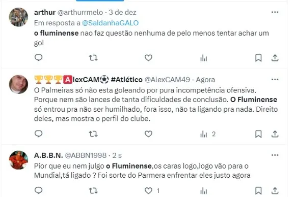 A falta de disposição do Fluminense diante do adversário foi o principal ponto abordado pela torcida. Os gols do Palmeiras deram a entender na torcida que o Tricolor das Laranjeiras ‘entregou’ o jogo.