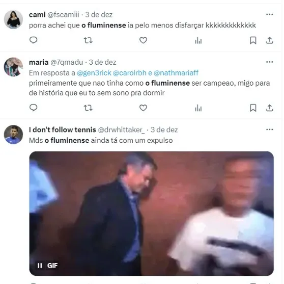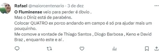 “O que o Fluminense tá entregando esse jogo, tá jogando só pra não tomar goleada“, disse um torcedor do Tricolor. “O Fluminense deveria ter vergonha de entregar um jogo desses. Mas se eles tivessem vergonha de qualquer coisa, não seriam os hipócritas que são“, completou outro torcedor.
