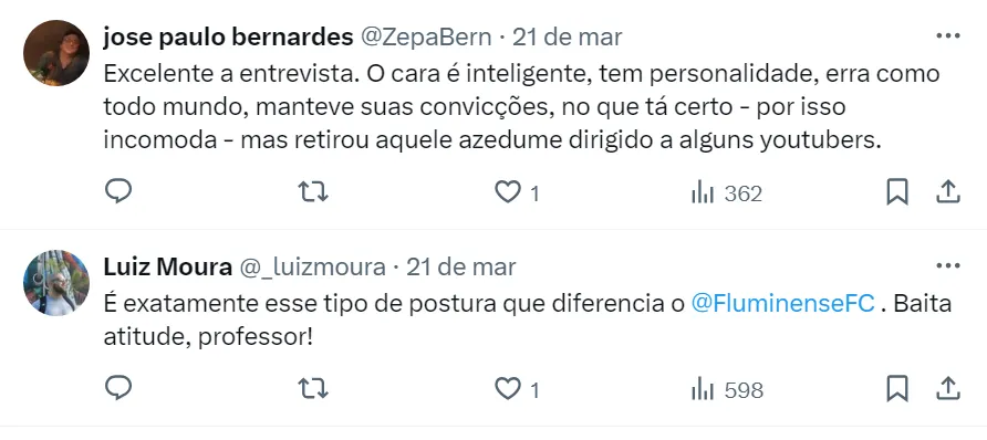 “É louvável a atitude do Diniz, porque foi ele que pediu a entrevista. Não foi uma coisa que alguém no clube se reuniu com ele”, afirmou o comentarista da ESPN. Com essa questão resolvida, o treinador tricolor concentra suas atenções na sequência da temporada.