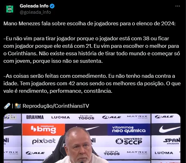 “Eu não vim para tirar jogador porque o jogador está com 38 ou ficar com jogador porque ele está com 21. Eu vim para escolher o melhor para o Corinthians. Não existe essa história de tirar todo mundo e começar só com jovem, porque isso não se sustenta. As coisas serão feitas com comedimento. Eu não tenho nada contra a idade. Tem jogadores com 42 anos sendo os melhores da posição. O que vale é rendimento, performance, constância“, disse Mano Menezes.