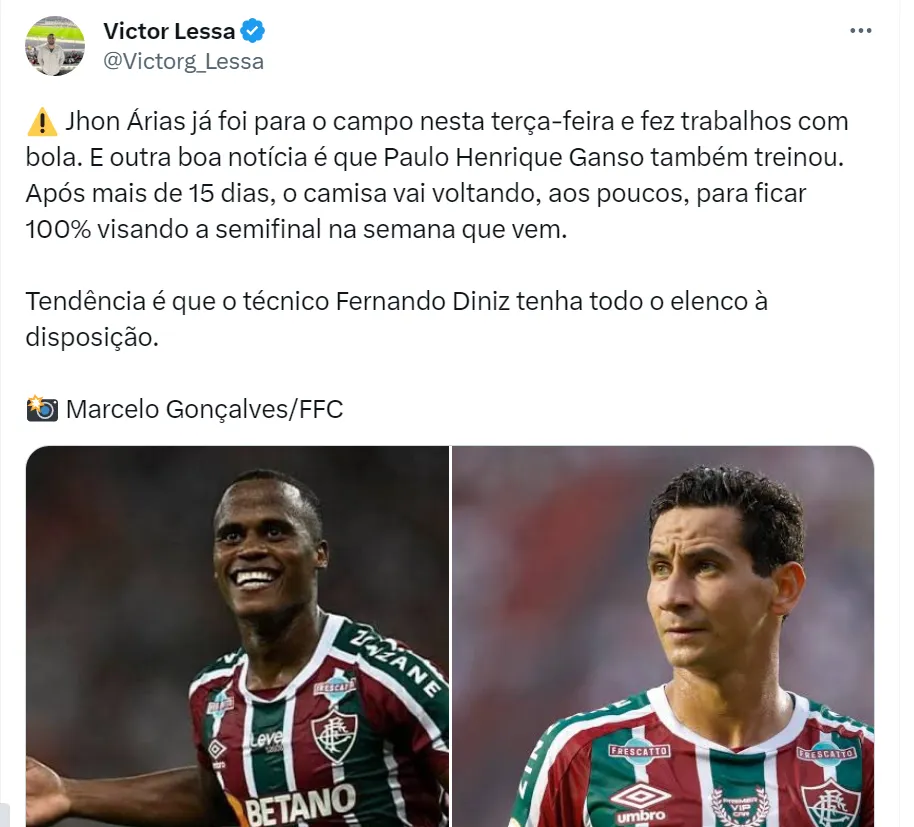 Segundo informou o jornalista Victor Lessa, o meia colombiano foi para o campo nesta terça-feira (19) e trabalhou com bola. Ele não deve ser problema para enfrentar o Internacional. Já o meia Paulo Henrique Ganso, que fez sua última partida contra o Olimpia, no fim de agosto, voltou a treinar com bola após 15 dias. O camisa 10 do Tricolor das Laranjeiras foi desfalque contra Fortaleza e Vasco.