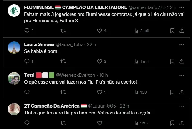 “Estou muito feliz por chegar ao Fluminense. Obviamente já conheço o estilo de jogo do professor Diniz e do Fluminense, que tem jogadores de muita qualidade. Chego para aprender muito“, disse o jogador uruguaio.