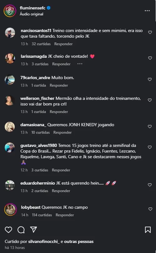 Após a vitória sobre o Glorioso, os torcedores do Flu não perderam tempo e aproveitaram os treinos para demonstrar apoio e enviar mensagens claras ao novo técnico: querem ver John Kennedy mais em campo. Nas redes sociais, diversos comentários ressaltaram a intensidade do jogador.