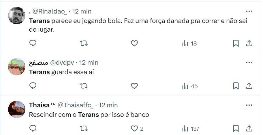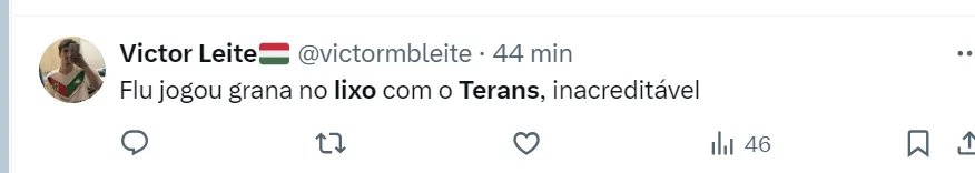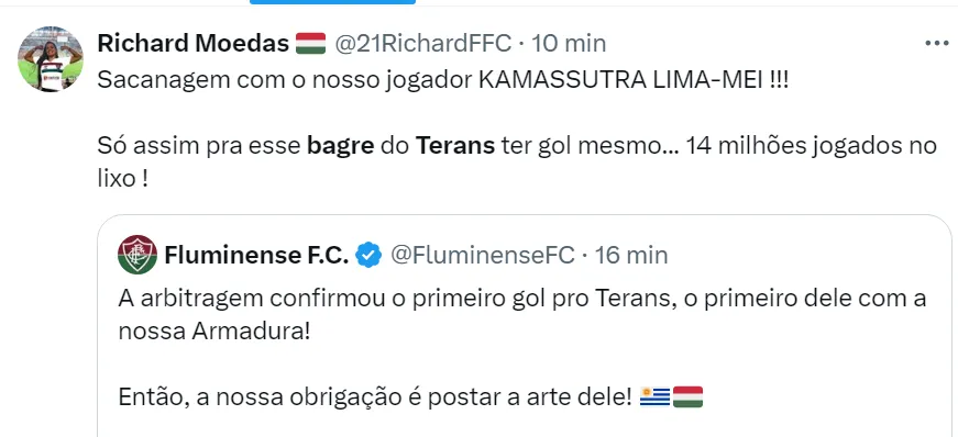 Trata-se do meia David Terans, que assinou com o Fluminense por três anos e custou cerca de R$ 14 milhões. Apesar do gol marcado, os torcedores não gostaram da atuação do meia uruguaio e sugeriram uma rescisão contratual.