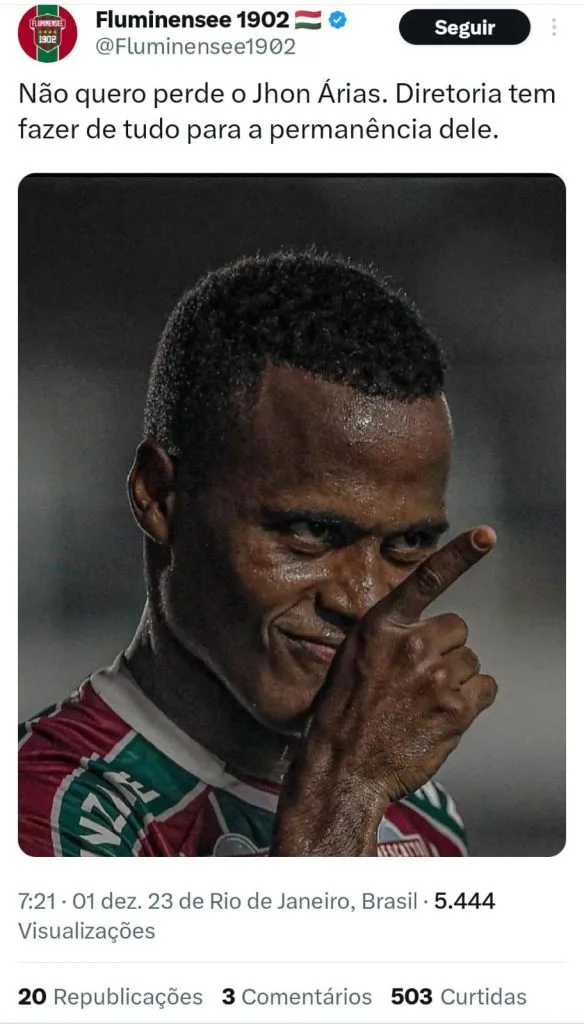 Se André e Nino estão com os dias contatos para deixar o Fluminense, a situação de Jhon Arias pode ser um pouco diferente. O jogador também tem sido alvo de clubes do futebol europeu, mas ele deve ser mantido para a temporada 2024.