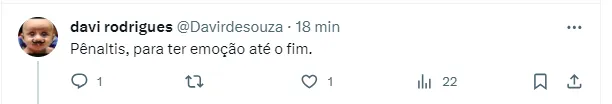 No entanto, caso o jogo insista em ficar empatado após os 120 minutos (tempo normal + extra), aí sim o jogo irá para as penalidades, em que cinco jogadores de cada time cobram de maneira alternada. Se eles continuarem empatando, uma cobrança para cada até alguém converter e o adversário errar.