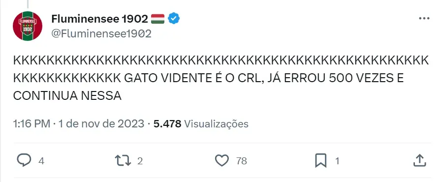 Agora, a torcida do Fluminense torce para o gatinho Milu errar mais uma previsão e, dessa forma, que o time de Fernando Diniz consiga derrotar o Boca e seja campeão de forma inédita da Libertadores