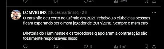 O cara não deu certo no Grêmio em 2021, rebaixou o clube e as pessoas ficam esperando ser o mesmo jogador de 2017/2018. Sempre o msm erro